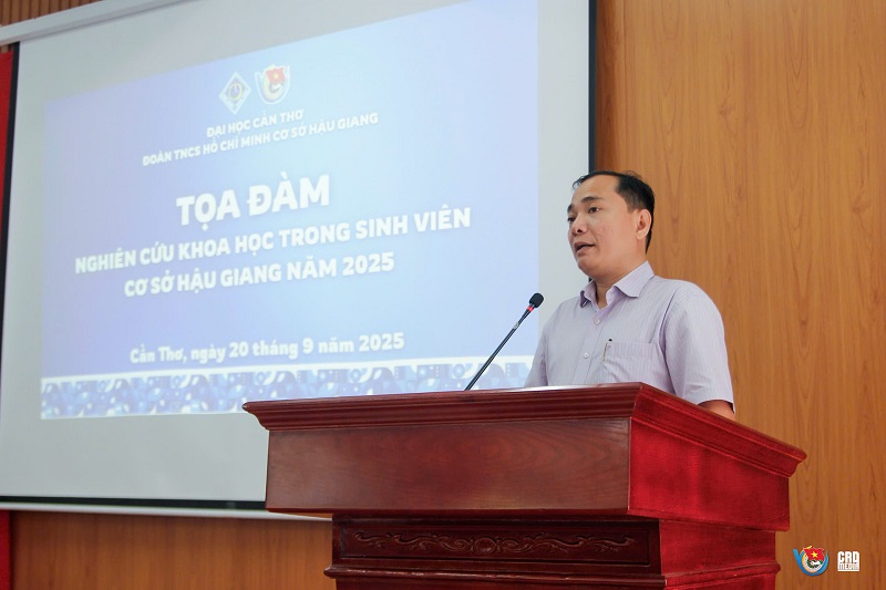 Sáng ngày 20 tháng 9 năm 2025, tại Cơ sở Hậu Giang – Đại học Cần Thơ. Bộ môn Kinh tế Phát triển phối hợp cùng Đoàn Thanh niên Cơ sở Hậu Giang đã long trọng tổ chức buổi “Tọa đàm Nghiên cứu khoa học trong sinh viên năm 2025” với sự tham dự của đông đảo quý đại biểu, giảng viên, khách mời và sinh viên. Buổi tọa đàm vinh dự đón tiếp sự hiện diện của PGS.TS. Võ Hồng Tú – Phó Giám đốc Cơ sở Hậu Giang; PGS.TS. Nguyễn Duy Cần – Nguyên Trưởng Khoa Phát triển Nông thôn; anh Phạm Việt Truyền – Bí thư Đoàn TNCS Hồ Chí Minh Cơ sở Hậu Giang; cùng các khách mời là anh Đào Nhật Tân – Nguyên Ủy viên Ban Thường vụ Đoàn Khoa Phát triển Nông thôn và anh Trương Tấn Thái – Nguyên Ủy viên Ban Chấp hành Đoàn Khoa Phát triển Nông thôn.