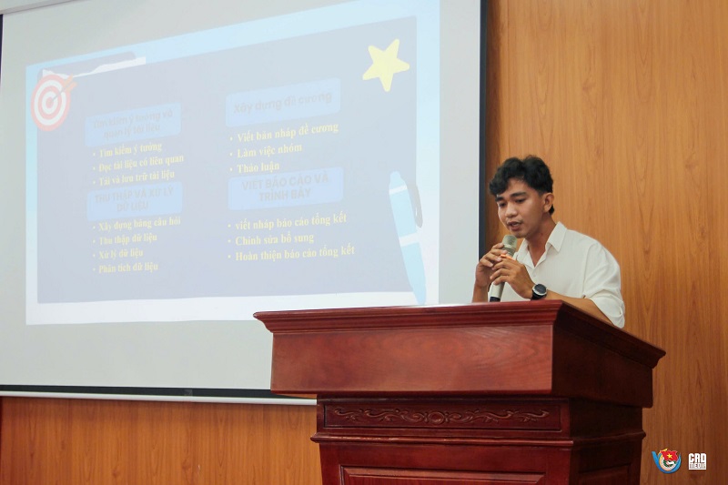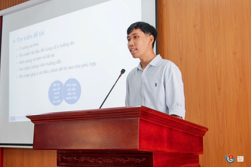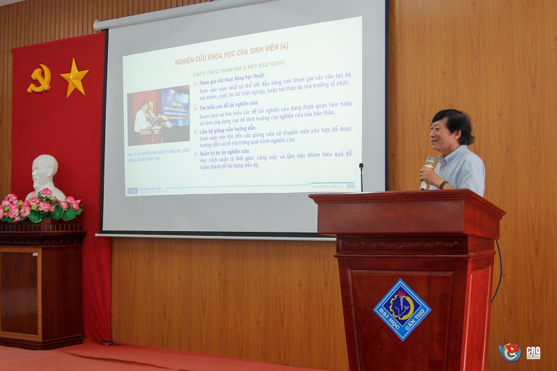 Trong không khí sôi nổi và cởi mở, chương trình đã mang đến nhiều nội dung phong phú và thiết thực. Tiêu biểu là chuyên đề “Nghiên cứu khoa học – Cơ hội phát triển tư duy sáng tạo của sinh viên” do PGS.TS. Nguyễn Duy Cần trình bày, giúp các bạn sinh viên hiểu rõ hơn vai trò và giá trị của nghiên cứu khoa học trong học tập và thực tiễn. Tiếp đó, phần chia sẻ của anh Đào Nhật Tân và anh Trương Tấn Thái về kinh nghiệm triển khai đề tài NCKH từ sinh viên khóa trước đã mang đến những câu chuyện gần gũi, bài học quý báu, tạo thêm động lực để các bạn sinh viên mạnh dạn bắt tay vào những đề tài nghiên cứu mới.