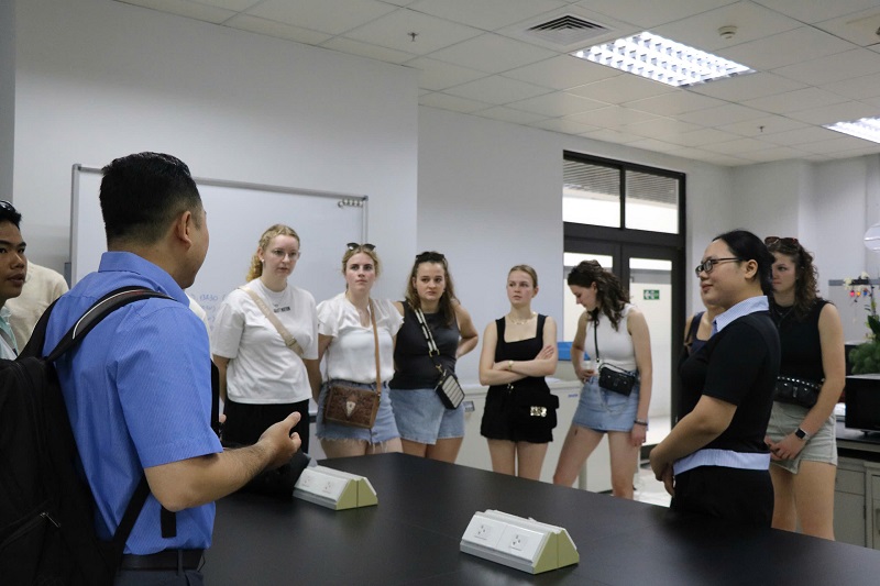 PGS.TS. Nguyễn Khánh Thuận dẫn đoàn các bạn sinh viên Hà Lan tham quan tại Tòa nhà công nghệ cao (ATL) – Đại Học Cần Thơ.