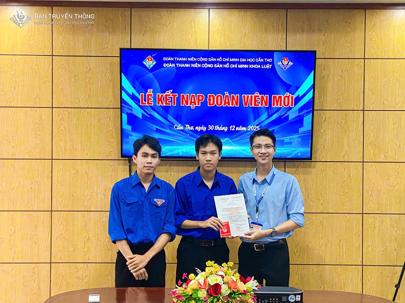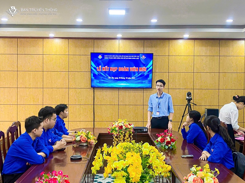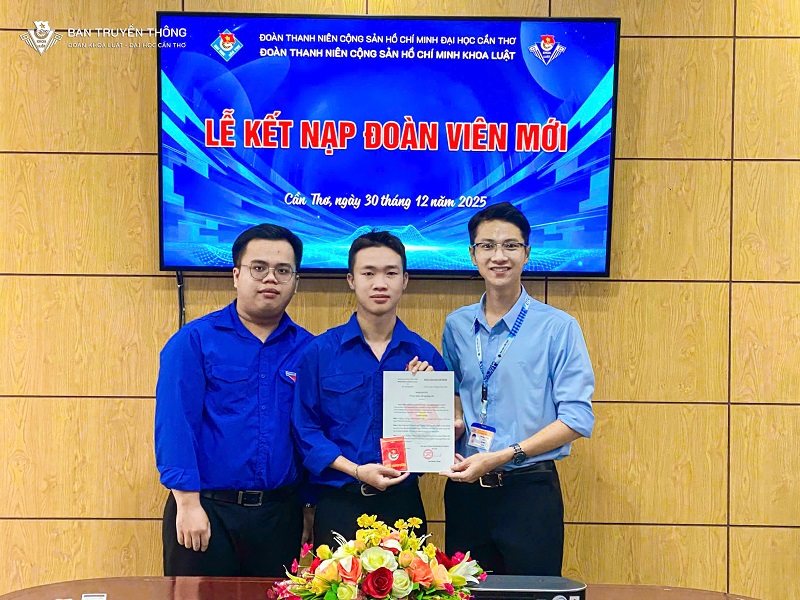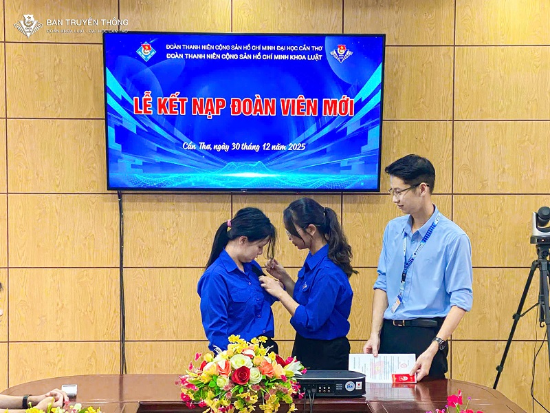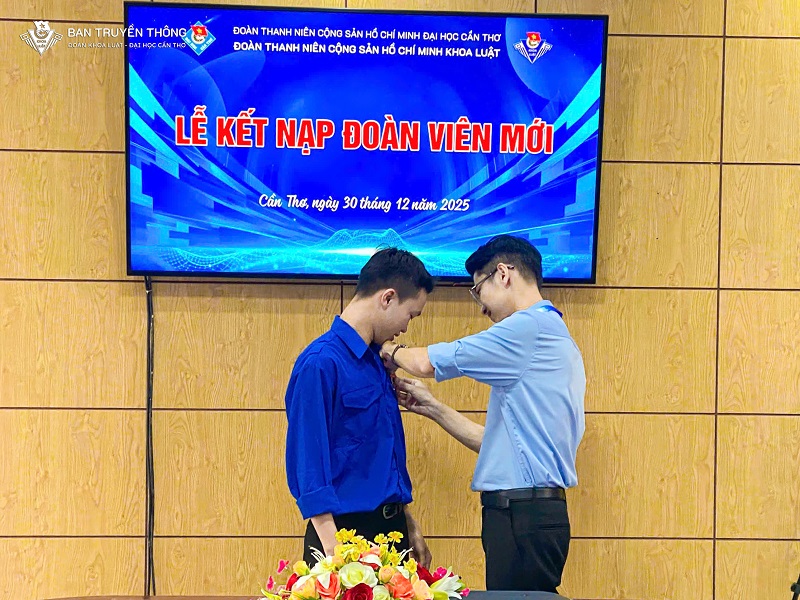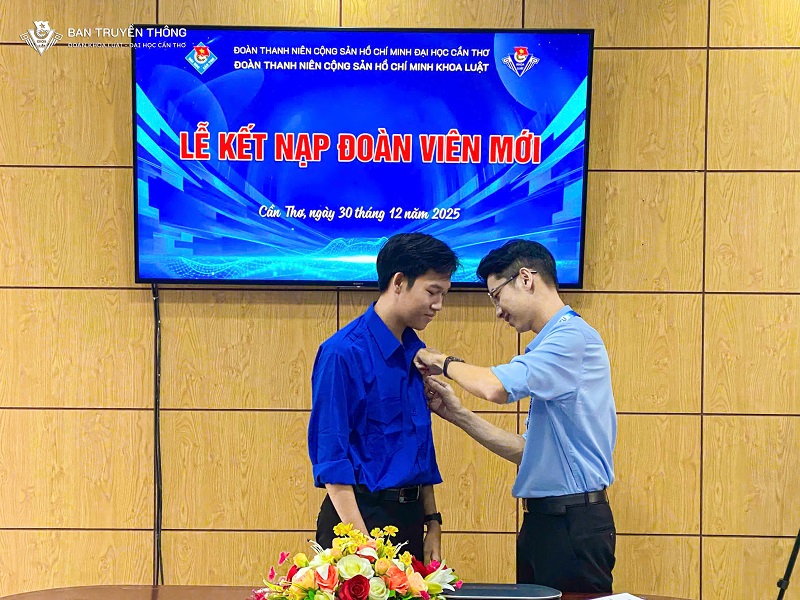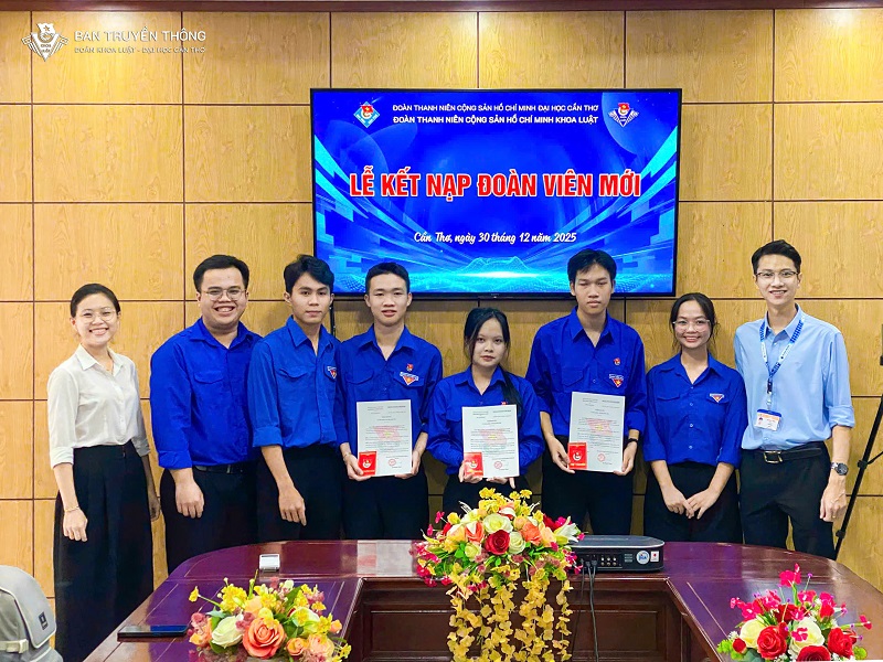 Căn cứ Thông báo số 21/TB-ĐTN ngày 04/12/2025 của Đoàn Đại học Cần Thơ về kết quả lớp Cảm tình Đoàn năm 2025; nhằm đảm bảo thực hiện đúng Điều lệ Đoàn TNCS Hồ Chí Minh và các hướng dẫn của Đoàn Đại học Cần Thơ, chiều ngày 30/12/2025, Đoàn Khoa Luật đã tổ chức Lễ kết nạp Đoàn viên mới tại Văn phòng Khoa Luật.