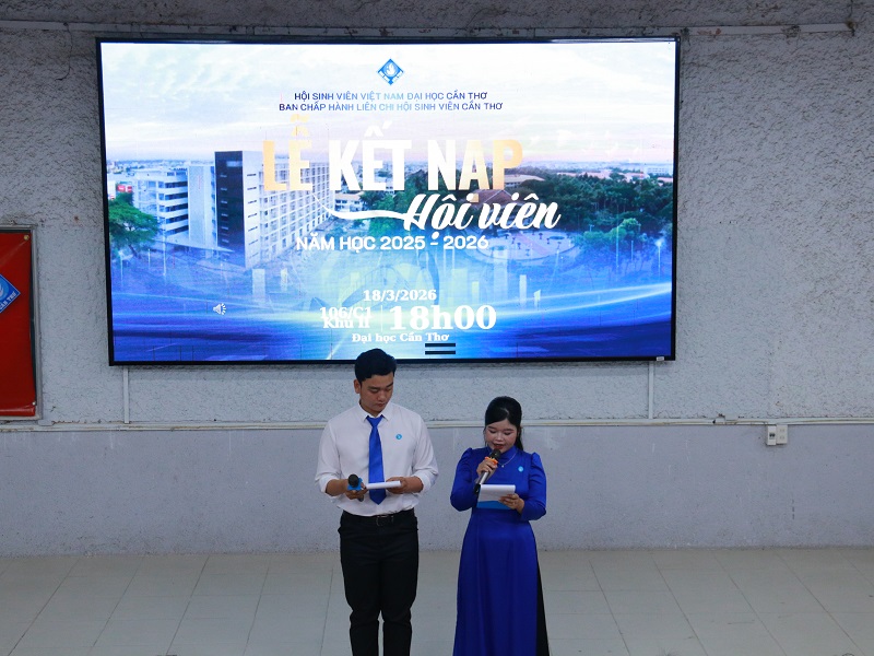 Căn cứ vào kế hoạch số 04/KH-LCHSV ngày 10/3/2026 của Liên chi hội sinh viên Cần Thơ về việc tổ chức Lễ kết nạp Hội viên năm học 2025 - 2026; nhằm thiết thực lập thành tích chào mừng Kỷ niệm 60 năm thành lập Đại học Cần Thơ (31/3/1960 - 31/3/2026); Kỷ niệm 95 năm Ngày thành lập Đoàn TNCS Hồ Chí Minh (26/3/1931 - 26/2/2026); Kỷ niệm 50 năm Ngày thành lập Đoàn TNCS Hồ Chí Minh Đại học Cần Thơ (26/3/1976 - 26/3/2026). Tối ngày 18/3/2026, tại phòng 106/C1 khu II - Đại học Cần Thơ, được sự cho phép của Ban Thư ký Hội Sinh viên Việt Nam Đại học Cần Thơ, Liên chi hội sinh viên Cần Thơ đã tổ chức “Lễ kết nạp Hội viên năm học 2025 - 2026”, chính thức kết nạp 882 bạn sinh viên vào tổ chức Hội Sinh viên Việt Nam